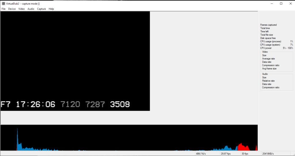- From the main startup screen, choose the menu option “Capture”, then “Capture AVI…”. VirtualDub2 will enter capture mode.