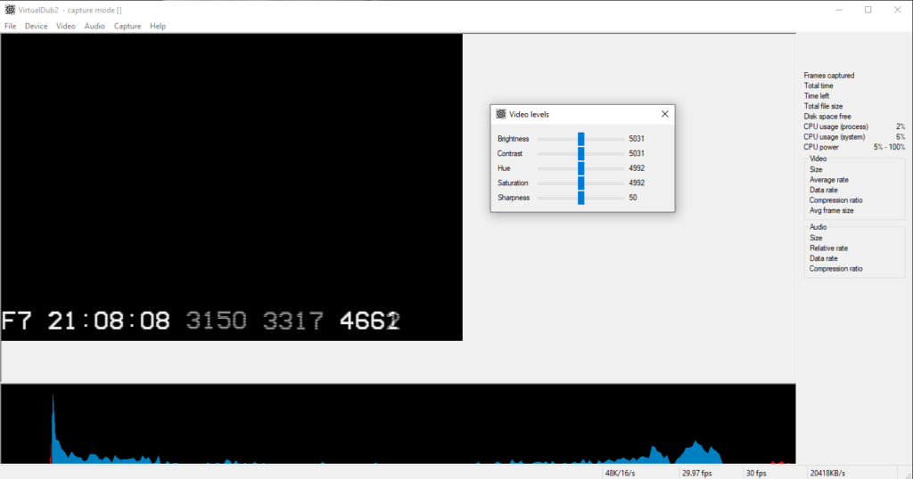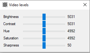 With VirtualDub2, you have two options for accessing the video proc amp settings while in capture mode. The best option is the menu item “Video/Levels”, which displays this dialog: