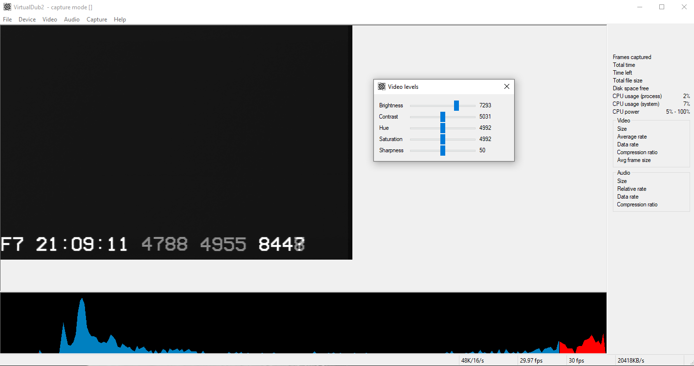 With VirtualDub2, you have two options for accessing the video proc amp settings while in capture mode. The best option is the menu item “Video/Levels”, which displays this dialog: