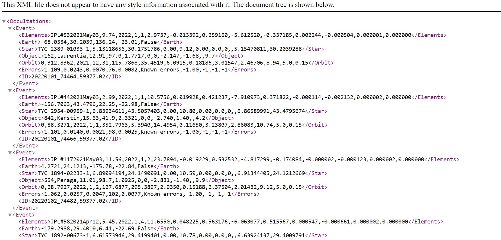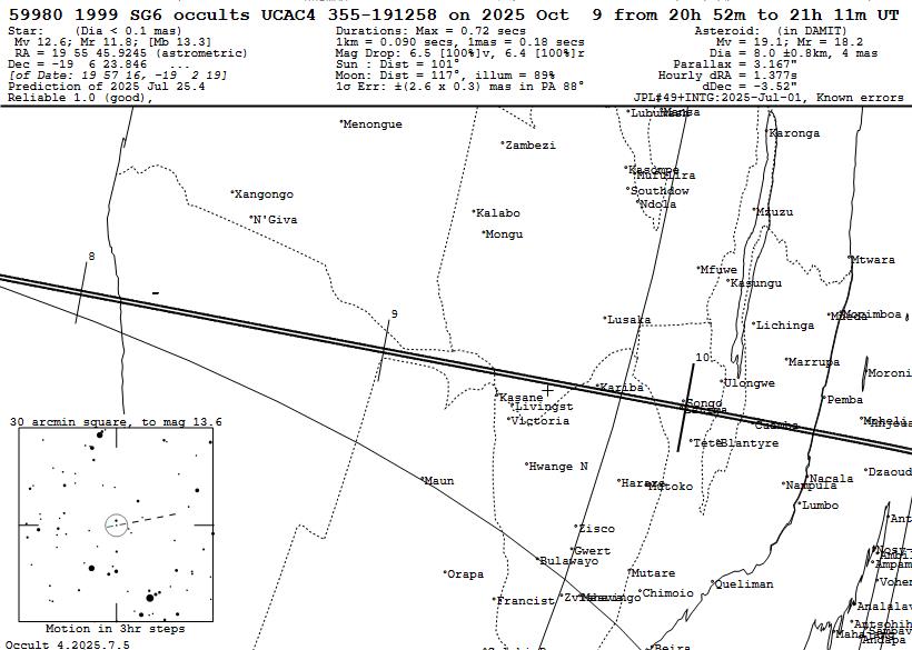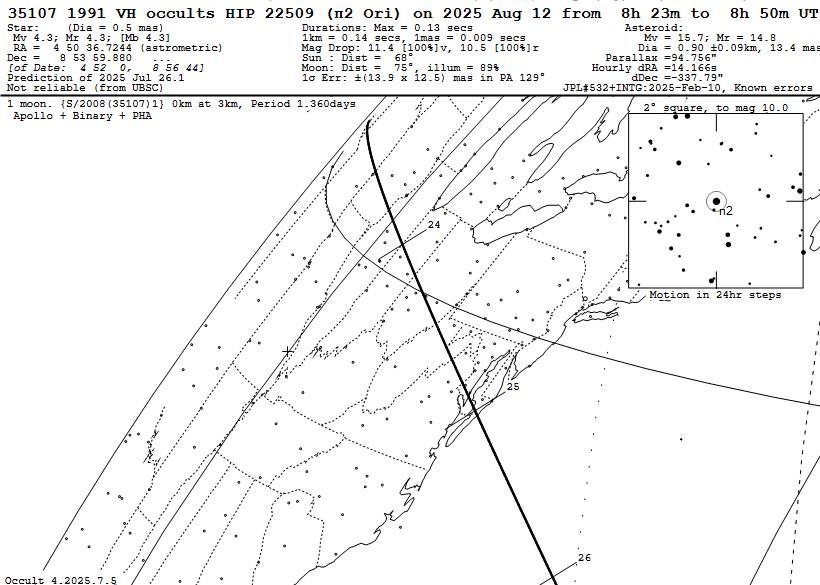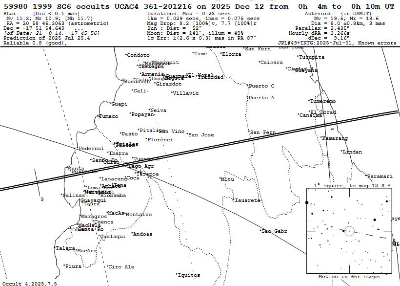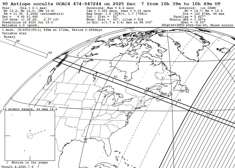 These occultations are described and illustrated in this .pdf document, updated with maps and tables emphasizing the newly-added special objects. Read that document to learn about the newly-added objects, many of them from occultation discoveries made since the initial 2025 special MB calculations were done in late August 2024. Also, Dave Herald has a list of nearly 100 asteroids with confirmed or suspected moons, primarily from past occultations, which I've gone through to add the more promising objects that were overlooked before. Also, now we are differentiating between events of lower probability of a satellite detection, deserving of observations from observatories and convenient home locations, while another group has higher probability for finding a moon and in our opinion, warrant expeditions to observe the occultation from several mobile stations. The first category usually involve small satellites far from their primaries, and also most objects from the GAIAMOONS project, where the existence of a satellite is usually far from certain, and we are not able to prioritize among them. You should watch for emails from Raphael Lallemand sent to the IOTAoccultations and Planoccult lists; she often gives advice about how large the satellite may be, and sometimes an estimate of where it may be relative to the primary object; in those cases, when the expected moon may be large and relatively close to the primary, some mobile efforts would be justified. There is more explanation of this in the .pdf document, which also has information about especially the occultation discoveries with object sizes and separations given in km in the sky plane. to help you guage the chances for individual objects. The .pdf document includes several hot links to external Web pages, but links to internal files, especially the .xml input files used by the Occult program, are given below. The first map and table, and some other information given in the .pdf file, were published on pages 248 and 249 of the Observers Handbook for 2025, but there are several new maps and tables for the "most special" objects deserving mobile efforts. _ _ _ _ _ OCCULTATIONS BY (90) ANTIOPE This is a binary asteroid with equal large (~90km) components 171 km apart. Special procedures are needed to show paths of occultations by the separate components, which is crucial for these events; often only a miss by both components will occur at the central line of an uncorrected prediction. The only reasonably good Antiope event for N. America will occur on 2025 Dec. 7, a 13.2-mag. star visible from southern Canada and Mainearound 10:40 UT. _ _ _ _ _ OCCULT INPUT .XML FILES FOR 2025 When you open these files with your Web browser, you should get a display that looks like this. The larger files may take a couple of minutes to show this appearance, showing a messed-up display before then. Once the proper view appears, right-click anywhere on the display, then "Save as" to a directory on your computer; the best directory is the \Asteroid\ subdirectory in your Occult\ directory. All of the Occult input files below include all occultations of stars to magnitude 16.0 with solar elongation greater than 15 degrees. Earlier File, posted in January: 2025 special Main Belt occultations The above does NOT include the many other occultation binaries discovered after the file was generated in August 2024; use instead the new files given below. New Files for occultations by the now 126 special MB asteroids for late July - Dec. 31, 2025: rest 2025 all 126 special asteroids worldwide. North American subset of the above. The files below are for the 51 "most special" objects deserving, in our opinion, mobile multi-station efforts. Of course, these can also be observed from fixed sites, that we encourage, to augment mobile efforts. For finding events worth mobile efforts, we recommend limiting the events to mag. 14 since few mobile systems can record occultations of fainter stars with a good S/N ratio. rest 2025 most special asteroids worldwide. North American subset of the above but we recommend using instead the worldwide file since we've found that, with the geographical (long./lat.) limits, sometimes events near the edges are missed. ______ OCCULTATIONS BY EMIRATES MBR MISSION TARGETS These are mapped, tabulated, and described for North America on pages 7 and 8 of the .pdf document. But there are some brighter occultations of these objects in other parts of the world; anyone can find those in their area using the worldwide Occult file given below. We give immediately below links to Occult maps showing 4 of the best events that some may want to try: Aug. 28 8.5-mag. occultation by Rockox, northernmost Chile & Bolivian Altoplano, the brightest event visible from land during the rest of 2025. Oct. 9 12.6-mag. occultation by 1999 SG6, north Namibia to Mozambique. Oct. 28 10.6-mag. occultation by Justitia, northernmost Israel to north Jordan, the brightest Justiutia event visible from land during the rest of 2025. A nice event, except the solar elongation is 27 deg.; in the path about 50 km south of Damascus, the star alt. will be +16 deg. and the Sun alt. -12 deg.; some tests with similarly bright stars should be made under good conditions to see if 80mm "midi" systems might record the event or if a larger scope with a red filter (to darken the strongly twilit background) might be needed. At least, it is a dawn event so the target can be found and tracked in a darker sky. Justitia is the largest main (and last rendezvous) MBR target. Dec. 12 11.3-mag. occultation by 1999 SG6, Ecuador to north Guyana, the brightest 1999 SG6 event visible from land during the rest of 2025. Occult input files for the 7 UAE MBR mission targets: Rest 2025 UAE-MBR events to mag. 16 worldwide. We found 10 events involving them in North America during the rest of 2025; see the .pdf document for a map and table of them. Click here for the full Occult table of them. We also generated this 