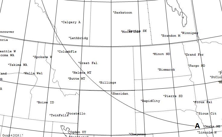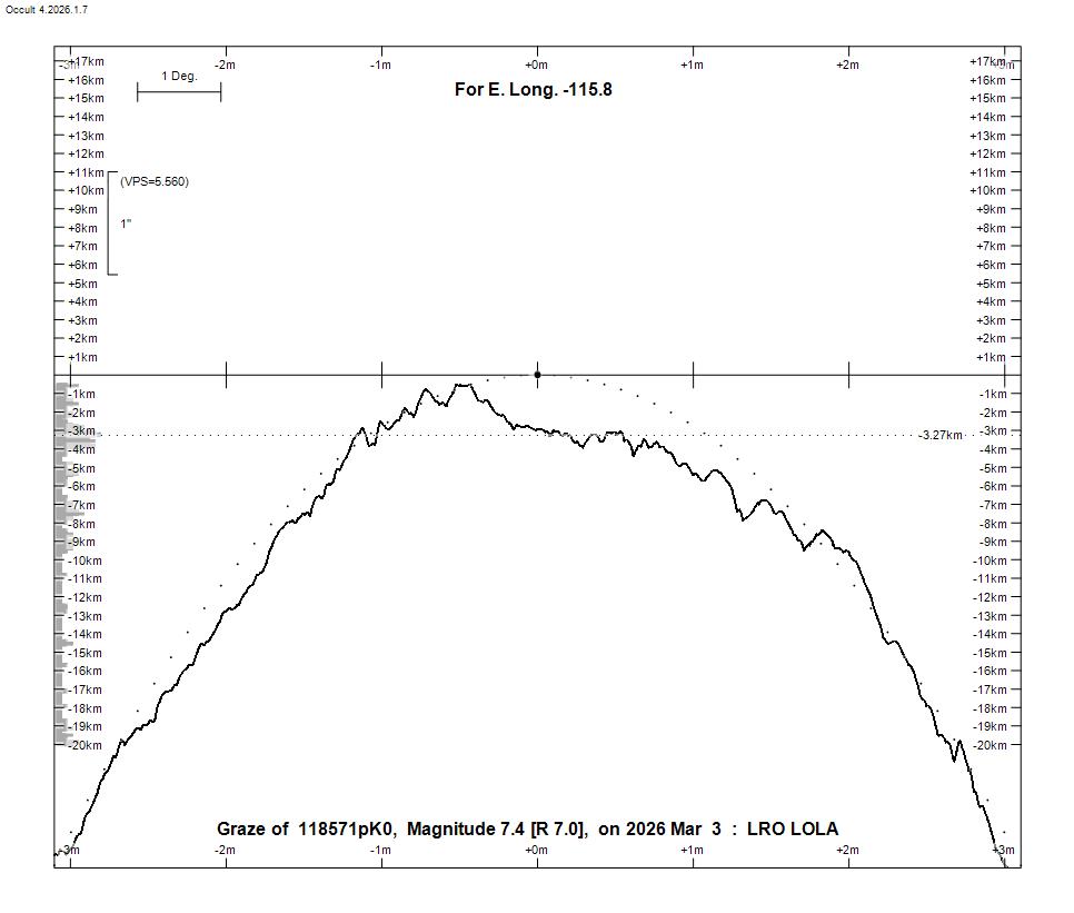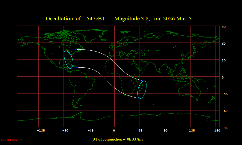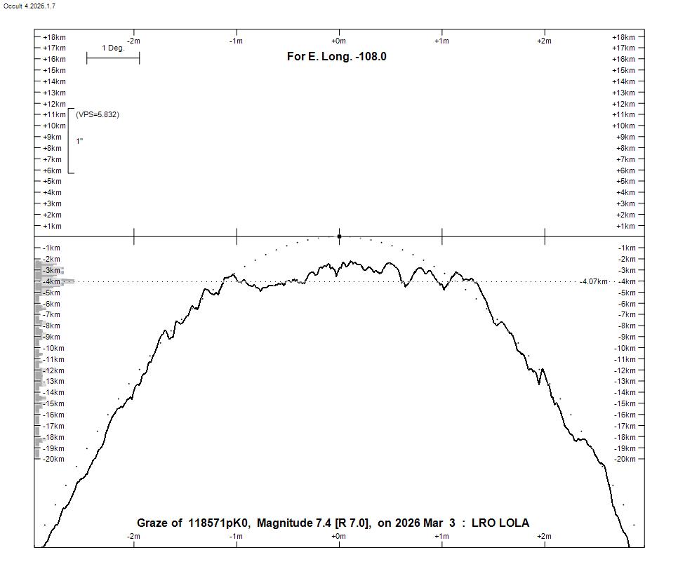On Feb. 26, two meessages to the IOTAoccultations groups.io list discussed opportunities for the March 3rd total lunar eclipse; I copy thier messages below, with comments and information that I've added: Brian Cudnik wrote: Also keep an eye [or better, camera] out for lunar meteor impacts. The 2019 total lunar eclipse showed that this is very much possible. I suggest starting with the darkened half about 10:30 UT and continue monitoring thru the 58 minute totality phase until about 12:45 UT, or when the Moon gets too low for your location. Good luck! Earlier, Michael Camilleri via groups.iowrote: The upcoming lunar eclipse on March 2nd/3rd gives a huge opportunity for lunar occultations of stars much fainter than usually possible. Occult 4 will run the predictions for you and accounts for the penumbra and umbra. For my site there are about 70 events (NZ is in the totality zone). East coast of Australia and West Coast of NA and Japan also have the entire eclipse so observers there will have similar numbers of events. Areas further away still have a lot of events. I wrote: ***HOWEVER, all of the cameras we use these days are red-sensitive, so they enhance the Moon’s red umbra, making it hard to observe occultations against it. My experience has been that with 20cm SCT’s, occultations of even 9th-mag. stars can be difficult to record. If a volcanic eruption a few months before the eclipse has ejected enough dust and sulfur dioxide into our atmosphere, it will darken the umbra and fainter occultations can be observed, but there have been no such recent volcanic events. OCCULTATION AND GRAZE OF 7.4-MAG. SAO 118571 for WESTERN NORTH AMERICA (by D. Dunham) I think for this eclipse, ONE OCCULTATION will be outstanding for North Americans – it is the occultation and graze of 7.4-mag. SAO 118571 visible from western N. America. Observations will be valuable to characterize the possible close duplicity of the star; according to Occ 585, recorded photoelectrically by D. Edwards on 1979 April 9, the star has an 8.8-mag. companion 0.034” away in PA 104 deg. as reported in Occultation Newsletter, but with that close separation, orbital motion will surely change the PA for 2026. Below is information about the graze path. But first, I’ve generated total lunar occultation predictions for 144 North American cities for this occultation in this plain text file; read the information at the top of that file for important explanatory information. You can also generate predictions for your location using Occult4 where you can generate a local Moonview. Here is an Occult4-Moonview showing the paths across the Moon for several major cities for this occultation. 15 selected N. American (and one Hawaiian) cities were used; showing more clutters it up too much, making it illegible. With your image viewing software, expand the view to make the city #s more legible. The cities are listed in this prediction file for just them with the same city #s as on the Moonview. Read the comments at the top of that file for more about the occultation. Predictions for many occultations during the eclipse are given in prediction files for all of 2026 for five Arizona observatories that you can get here. THE NORTHERN LIMIT GRAZE PATH passes along the Rocky Mountains that form the British Columbia-Alberta border, then crosses w. and s. Montana, n.e. Wyoming, and Nebraska before the altitude becomes too low west of Omaha, as shown on the map on p. 173 of the 2026 RASC Observer’s Handbook and on the 1st page of the .pdf here. This Occult map shows the path relative to major N. American cities. The corresponding annotated northern limit prediction gives the U.T. of central graze, and circumstances, as a function of longitude. It is an edited version that has removed data for the same longitudes covering the path in the high Arctic where the graze will be too low to observe. Occult4 does not give the percent sunlit of the Moon along the graze path; this is important during lunar eclipses since the percent sunlit of the part of the Moon's disk NOT in the umbra (that's the xxE number where E indicates lunar eclipse, rather than the usual + or - for waxing and waning phases) changes rapidly along the path and is important to assess the visibility of the graze. I've added this value, obtained for the corresponding times, from various total occultation prediction lists. The Occult graze list DOES give the umbral distance in place of the cusp angle; the umbral distance (U rather than N or S) is 0 if the event is at the center of the Moon's umbra (the darkest part) and is 100 at the edge of the umbra. The limit data are computed for an elevation above sea level of 500m, but the path shifts considerably with elevation; if you want to try to observe the graze, let me know the area where you plan to try and we’ll try to generate limit data for you, including Google Earth files, for site selection. Here are two graze profiles – one for the area west of Calgary and the other for s. Montana, where the profile will line up better to produce more occultations of the star by lunar mountains and craters. The current NWS cloud cover forecast map favor Montana (good for the graze there), and Nevada, s. Calif., Arizona, and N. Mex., and one for Alaska looks good for s. cen. and e. Alaska, but poor for Juneau and other parts of the panhandle, and the perenniel cloudy Aleutians. Oahu should be partly cloudy; but mostly cloudy over the other Hawaiian islands. M. Camilleri continued: If lunar grazes are your thing there might be a few in your region during full umbra, and they are much easier to observe as there is no bright terminator nearby. He notes there is an occultation of rho Leonis down the Eastern seaboard of NA. It is a bright mag 3.8 double star, extremely close so only usually observed by interferometry. **DD: but NO** - there will be an occultation of rho Leonis (ZC 1547) over the e. USA on March 3, but as this Occult map for the even