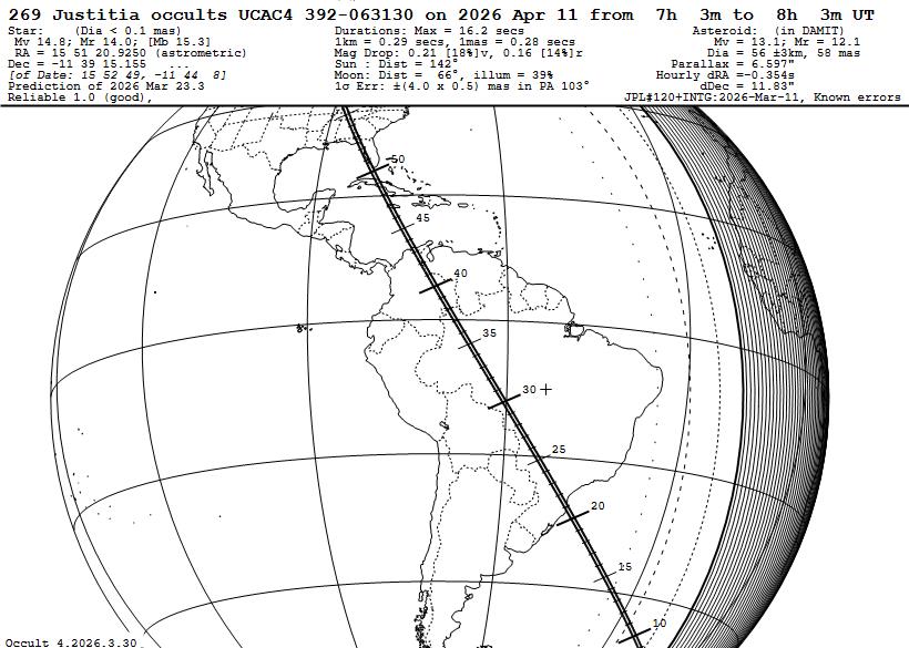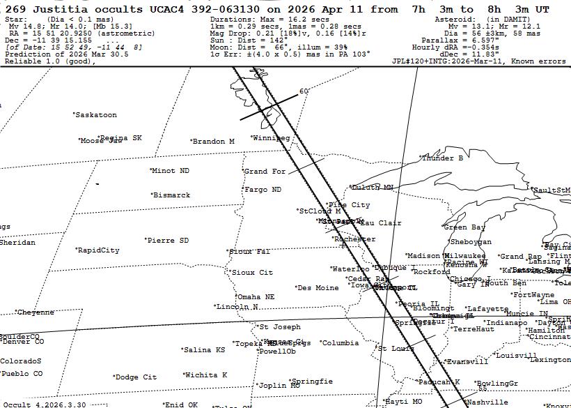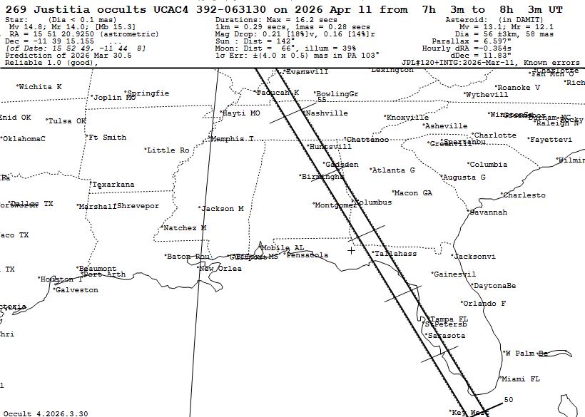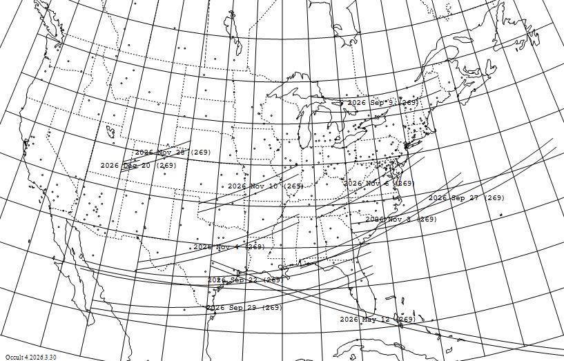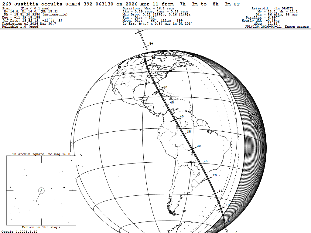 These occultations are described and illustrated (in maps and tables) in this 2026 predictions presentation that is modified from one given at the 2025 IOTA meeting. The maps and tables for the bright main belt occultations are on slides 3 and 4 of the 2026 predictions presentation linked to above, and those for the other categories follow them in a similar form. But in this file, I include, starting at slide 7, 7 slides explaining the challenges and special value of occultations by near-Earth asteroids (NEAs), especially by potentially hazardous asteroids (PHAs). Links to the .xml input files used by the Occult program, for main-belt and other categories of occultations (whose best events are also mapped and tabulated in the 2026 predictions presentation) are given below, including hundreds or even thousands of observable events worldwide, and usually including North American subsets of them. The above cover all of 2026 but the information about the special MB asteroids is based on what we had for them in 2025 August that didn't include the many new objects that we have included in NEW "Rest2026" input files linked to below. A map and table of the better 2026 North American occultations by special main-belt (MB) asteroids are on slides 14 and 15 of the presentation; they are the ones portrayed on page 250 of the Handbook. However, many more asteroids have been added in this further update of that work, and new maps and tables created that you will be able to find in a new Web page for them that will be added in about 10 days; in the meantime, read the the 2025 Web page and its .pdf document with link near the top of that page. We now have newly-discovered moons of dozens of asteroids, as well as several with unusual shapes suggestive of contact binaries that deserve further scrutiny. Consequently, there are now 168 of these special asteroids for which we now have Occult prediction input files for the rest of 2026 given below that you can download and use Occult4 to generate lists for your observatory that can be used to prioritize your observations. About half (80) of these are copied into "MOST SPECIAL" files; these asteroids are considered the most likely to find important new information because of likely contact or near-contasct binaries, or higher chances of successful mobile efforts, especially if observed from two or more stations since the separations of the possible moons in these cases are mostly less than ten times the expected moon's diameter. _____________________________ Except for the special MB asteroids, we will not be posting pages for the other categories (bright MB events, NEAs, Trojans, and distant objects, as we did ne for 2022, 2023, and 2024. It's too much work for us to prepare and update all those separate pages, so this year, like for 2025, we will not be doing that; so instead some links are given to the 2024 pages that have some general informstion applicable to their catagories. If anyone else wants to prepare any of them, we will help teach them how. Basic explanations of all categoris are given on pages 243-251 of the Handbook, so we provide in this .pdf document with the Handbook text, as we provided it in our last update on 2025 Sept. 1; a few minor editorial changes may have been made after that. It has the titles of the maps and tables to show where they should be, but you need to consult the 2026 presentation file with link above to see them. _ _ _ _ _ OCCULT INPUT FILES FOR 2026: Use of these files to generate your own predictions is described here. When you open these files with your Web browser, you should get a display that looks like this. The larger files may take a couple of minutes to show this appearance, showing a messed-up display before then. Once the proper view appears, right-click anywhere on the display, then "Save as" to a directory on your computer; the best directory is the \Asteroid\ subdirectory in your Occult\ directory. 2671 North American main belt events to mag. 10.3 filtered to remove events with errors greater than 0.4 path widths but also including several occultations by major planets and their satellites Worldwide version of the above file with 28231 occultations filtered to remove events with errors greater than 0.4 path widths - for the MB events, prediction maps and some data are available at https://www.asteroidoccultation.com/. Occultations by major planets and by their main satellites: Worldwide major planet/moon events including all Galilean sat. 1849 events. Worldwide major planet/moon events ave with mag. drop less than 0.2 excluded, 1506 events. The above include cases with high RUWE and a few (mainly valuable irregular moons events) with relatively large path errors. Occult Watcher is the best way to find out about upcoming events near your location; it includes the latest orbit updates from the JPL Horizons online system. You can learn about and obtain the software at this link. __________________________ JUSTITIA EXAMPLE FILES OF WHAT CAN BE DONE WITH THE INPUT FILES BELOW There is an interesting unusually slow occultation by (269) Justitia on the morning of April 11. The event, and the University of Virginia's large campaign for it, is described by Teddy Oakey in this .pdf file. The Apr. 11th path is shown in more detail in three zoomed in Occult Maps Path, Brazil to s.e. USA Path, southeastern USA Path, northcenral USA and Manitoba Map of 11 more Justitia occultations during the rest of 2026 in the USA to mag. 14.5 These are brighter than the April 11th event, but are all faster, especially the ones later in the year, as can be seen in the Occult table for them. __________________________ INPUT FILES FOR OTHER CATEGORIES OF OCCULTATIONS Near-Earth asteroids (NEAs to mag. 13.0, since these are brief events usually needing mobile equipment): Currently, worldwide files for most of these events can only be found on Preston's Web site at https://www.asteroidoccultation.com/. Also, the selection for North Americ