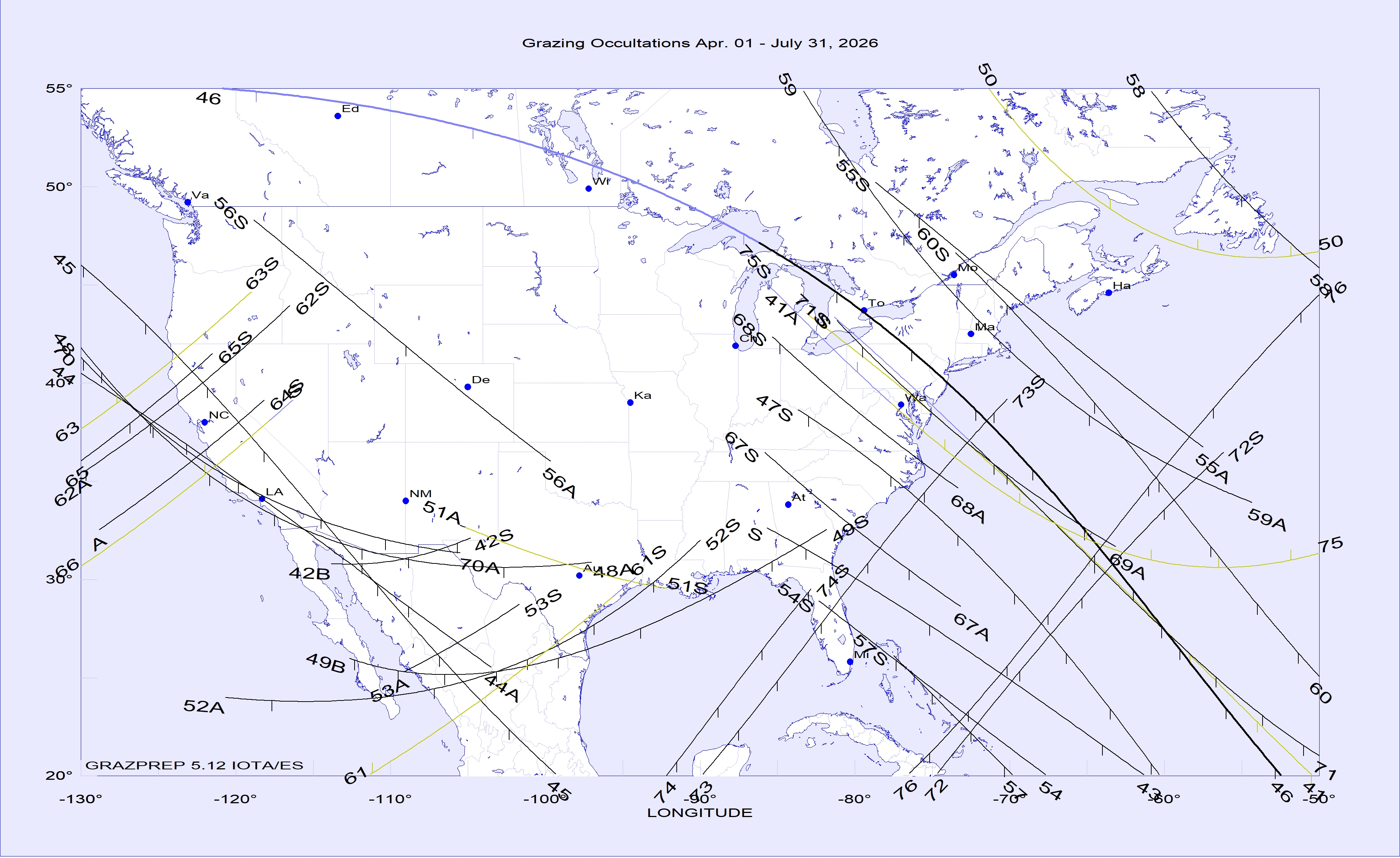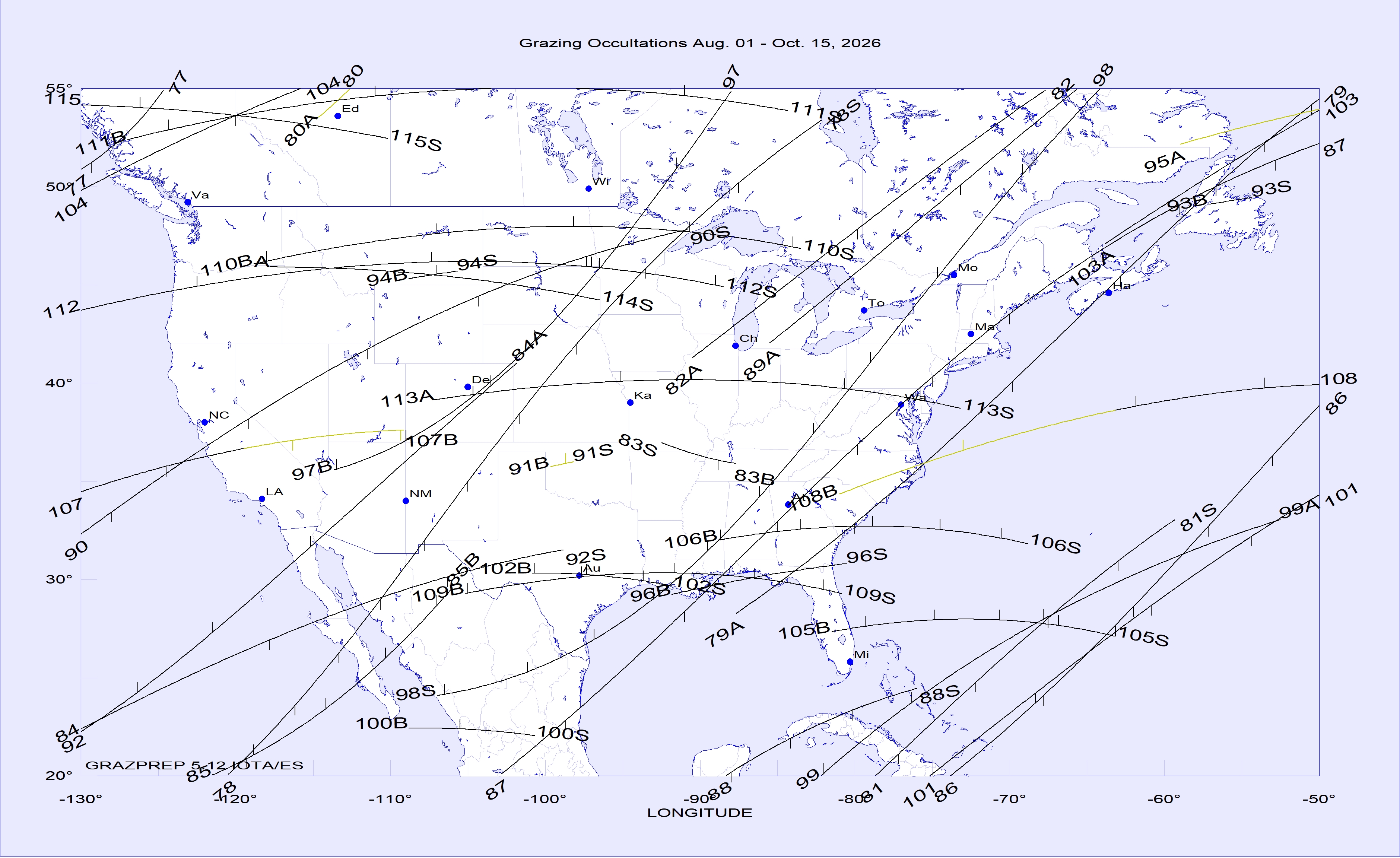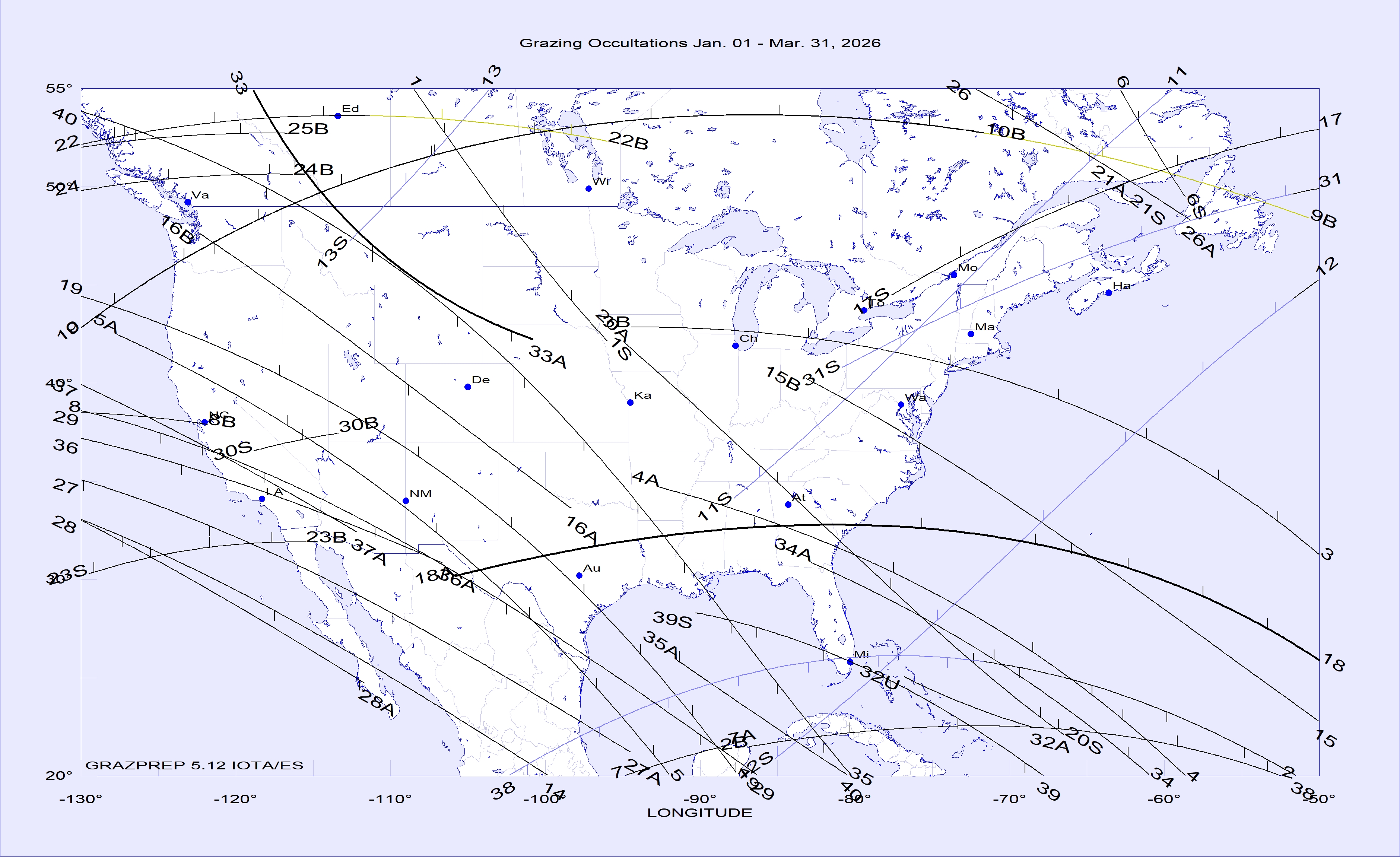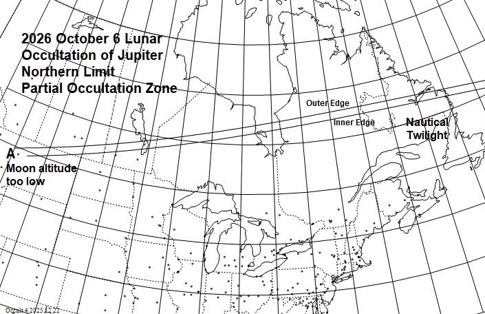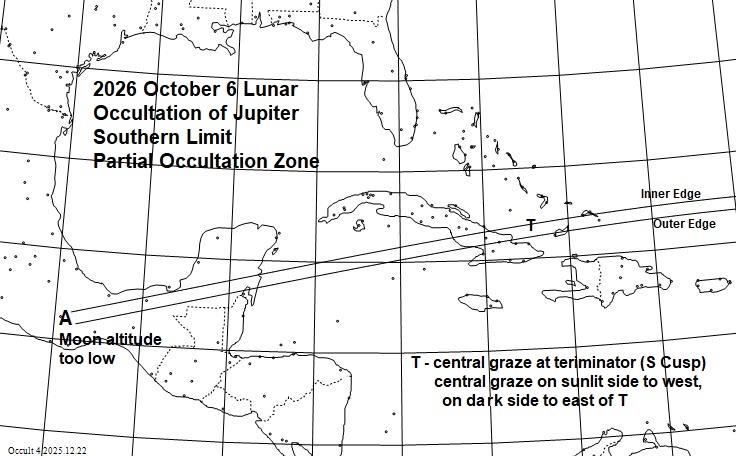 The best lunar grazing occultations of 2026 in North America are shown in a map and tables in this .pdf document. The map, tables, and text of the document are adapted from pages 171 to 174 of the 2026 RASC Observer's Handbook. But many additional good lunar grazing occultations that will be visible from North America in 2026 are shown in maps and tables with more detailed information given below. Below are links to maps and data for the brighter lunar grazing occultations in North America during 2026. There are 4 maps of populated parts of North America showing grazing occultations of stars brighter than mag. 6.5 (but fainter in the umbra of deep lunar eclipses), that should be visible with small telescopes. In the maps, the lines are: - nighttime dark limb: solid lines - nighttime bright limb: dashed lines - daytime dark- and bright limb: dotted lines We use thick lines for all occulted bodies 1.5 mag. and brighter, and for major planets, regardless of their magnitude. Much information about observing occultations of all types is in "Chasing the Shadow: The IOTA Occultation Observer's Manual" available for free download here but George Viscome's primer is better for current video and CCD camera techniques, although it concentrates more on asteroidal occultations with much less about lunar occultstions and grazes. _____________________________ Grazing occultations in North America during 2026 to mag. 6.5 Table Map, Jan. 1 - Mar. 31 Map, Apr. 1 - July 31 Map, Aug. 1 - Oct. 15 Map, Oct. 16 - Dec. 31 Path data On the maps, time tick marks are on the north side of southern limits and on the south side of northern limits, that is, on the side of the limit that has a total occultation. The tick marks are at integral 10-minute intervals of U.T., with the U.T. at the western end of the path being given in the table. The Moon's shadow always moves from west to east across the map. The paths end in "A" when the altitude above the horizon equals the star's or planet's magnitude, and it ends in "S" if the Sun altitude equals the negative of the star's magnitude. The path ends in "B" if the graze goes onto the sunlit side of the Moon. Some remarks about some of the grazes of stars in the above maps and tables are given after the section immediately below about the limits for the Oct. 6th occultation by Jupiter. ______________________________ GRAZING (PARTIAL) OCCULTATION OF JUPITER BY THE MOON, 2026 OCT. 6 This will be one of the most spectacular lunar occultations of 2026, but it is not in the above maps or tables that only include grazes of stars by the Moon. Both its northern and southern limits are given in the map and table on pages 1 and 2 of the .pdf document. But the limit lines there are for the center of the planet. Since planets are not point sources like most stars, it is better to give data for two lines at each limit, an inner limit (or edge) where the planet is just completely covered only at the time of closest approach (the U.T. time given), and following it, an outer limit where the edge of the Moon just touches the limb of the planet at the time of closest approach. The inner and outer limits define the partial occultation zone, where the planet is partially but never completely covered during the graze; it is several km wide, depending on the angular size of the planet and the distance to the Moon. The partial occultation has its longest duration at the inner limit, near which mobile observers will want to travel to observe the phenomenon. The inner limit, or edge of the partial occultation zone, is south of the outer edge for northern grazes and is north of the outer edge for southern grazes. Whether the graze is northern or southern can only be told by the N or S in the file name, or the same letters following the cusp angle (CA) given in the last column of the path data posted below, as generated with Occult 4. Map, October 6, Jupiter, northern graze Map, October 6, Jupiter, southern graze Path data for the inner and outer edges of the partial occ'n zones October 6, Jupiter, northern graze October 6, Jupiter, southern graze Although observations of partial occultations of planets have no current scientific value, they are included since they can be interesting to watch, and recordings of them can have educational value. ______________________________ INFORMATION ABOUT SOME OF THE GRAZES OF STARS This refers to the event numbers given on the maps and in the tables in the top section above. #9: The star is ZC 440, epsilon Arietis that uses an average position of the two components of this interesting double. #10: The star is X54005, the secondary component only; if anyone wants to observe this graze, let us know. #32: This is during the March 3rd lunar eclipse in the Bahamas, where the Moon will be bright with 66% of its diameter sunlit (not in the umbra) at the start; this will be hard, since the graze will occur in the bright part of the umbra close to the edge, at umbral distances of 96-92% of the way from the center to the edge. The Univ. Time of central graze, and circumstances, as a function of longitude are in this Occult4 list. #33: This is a better event than #32, with the Moon about 30% sunlit and the umbral distance around 70%. Occult4 currently gives a wrong prediction for this graze, but we should be able to fix it before the eclipse occurs, and then we will update this page. #85: Grazprep shows this graze during the Aug. 28th partial lunar eclipse will likely be visible only from Mexico with about 30% of the Moon sunlit (not in the umbra) but rather near the bright edge of the umbra, and occuring on the bright uneclipsed part of the Moon when the path is in the USA so unobservable there. Accounts of observations of the 2024 November 27 graze of Spica, the annular solar eclipse of 2023 October, and of the total solar eclipes of 2024 April are included here, in the page for 2025 North American grazing occultations. ______________________________ NEW GRAZPREP VERSION 